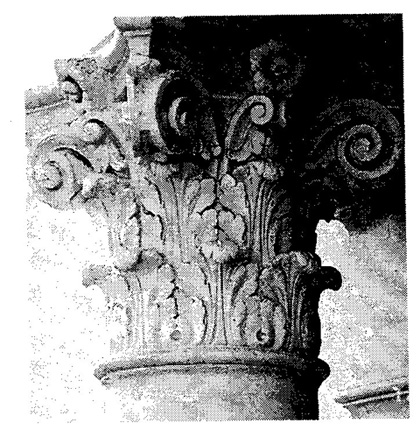 4. Detalhe do capitel mostrando quatro voluta, quatro flores e duas filas de folhas de acanto .