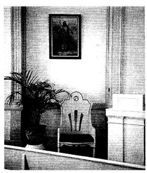 Há, à nossa esquerda. um leitoril. no qual fica o leitor de toda a palavra falada em todos os serviços. Perto dele há uma cadeira -a mais notável de todas as cadeiras. Atrás dela e pendendo da parede, abaixo do painel de Virgo. há uma figura do nosso Salvador. o Cristo ressuscitado, com sua mensagem implícita: "Siga-me". Esse é um lugar de meditação para os probacionistas. Você sabe que durante o ano, são realizados 339 serviços templários e de cura, 26 serviços de lua, 4 serviços de solsticios e equinócios e 1serviço de Noite Santa no Templo, totalizando 370 serviços em um ano. Simbolicamente, isso totaliza 10, novamente o número perfeito no Templo, no total de cerimônias realizadas nele.