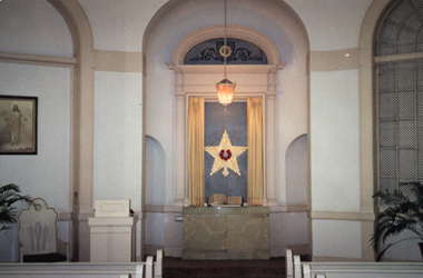 9. Vista do nicho do Altar, mostrando a Bíblia, aberta no primeiro capítulo do Evangelho de São João, o emblema da Fraternidade e o baldaquino semicircular.