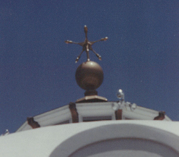 11- Finial* dourado sobre a cúpula do Templo encimado por um grupo de luzes. Nota: a palavra "finial" (inglês) corresponde ao nosso REMATE, em português.; também "arremate, apogeu, acabamento, adereço, adorno, ornamento, etc...; é o ornamento que faz o acabamento superior da pilastra. e sobre a cúpula do Templo.